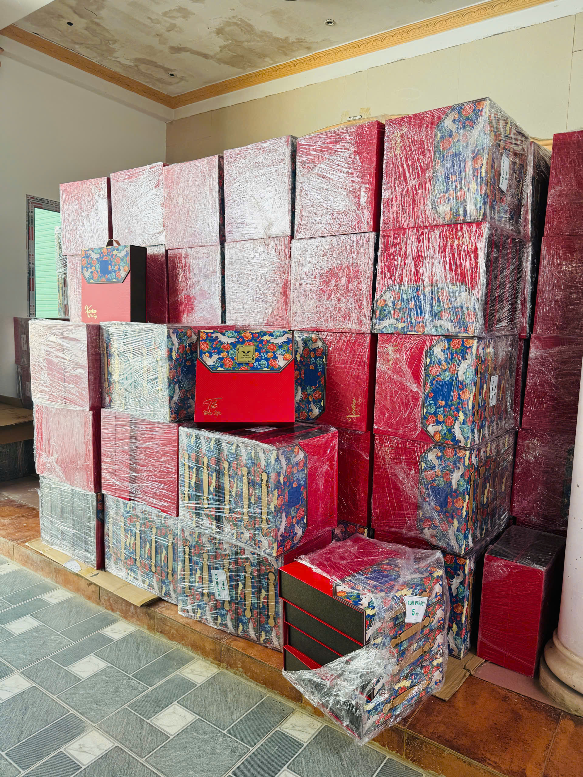 Hộp quà được thiết kế lấy cảm hứng từ kiến trúc cung đình, kết hợp họa tiết ánh kim và hiệu ứng in nổi 3D, tạo cảm giác quyền quý và trang trọng.