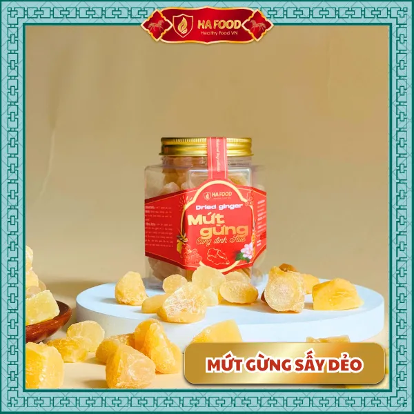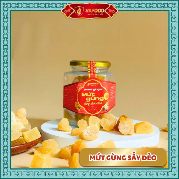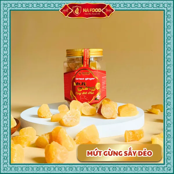 Gừng sấy dẻo Hafood – món ăn truyền thống giữ ấm mùa xuân. Vị cay nhẹ, ngọt thanh, mềm dẻo tự nhiên giúp kích thích vị giác và hỗ trợ tiêu hóa. Là món mứt Tết hiện đại, không phẩm màu, giữ nguyên tinh chất gừng tươi.