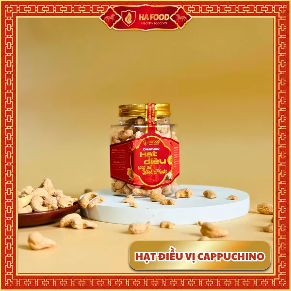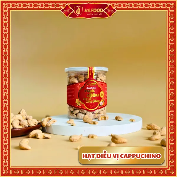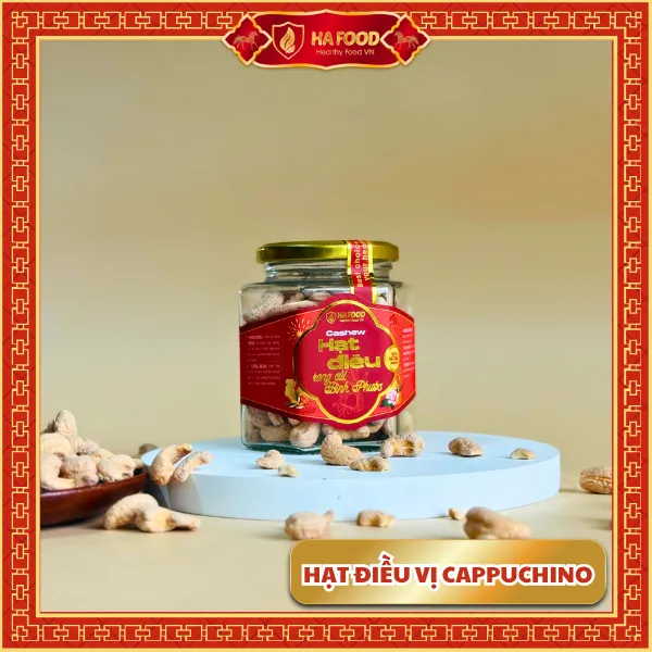 Hạt điều vị Cappuccino Hafood là sự hòa quyện hoàn hảo giữa vị cà phê Ý thơm nồng và hạt điều Bình Phước giòn béo. Mỗi hạt là một trải nghiệm hương vị tinh tế, đánh thức mọi giác quan. Giàu dinh dưỡng và năng lượng, sản phẩm thích hợp làm món quà Tết sang trọng, hiện đại, góp phần tạo điểm nhấn cho set quà Tết Hafood 2026 – tượng trưng cho khởi đầu tràn đầy hứng khởi và may mắn.