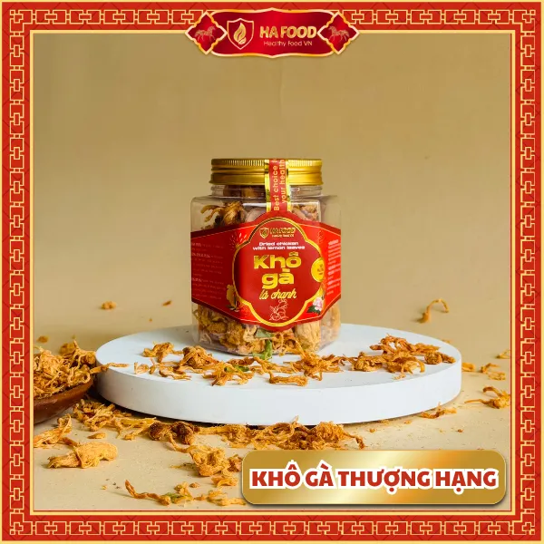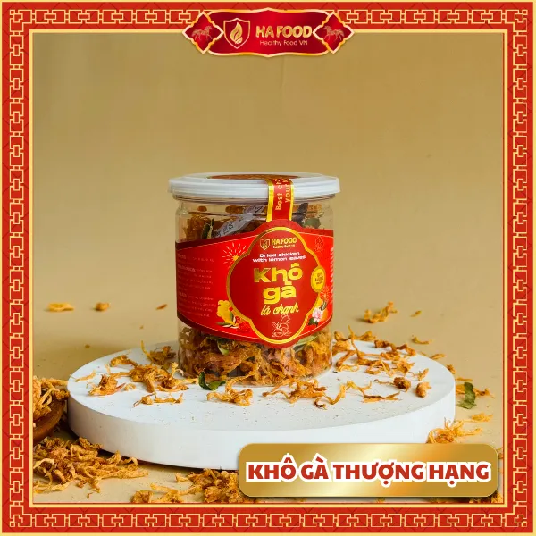 Khô gà lá chanh Hafood – hương vị truyền thống hòa quyện hiện đại. Thịt gà được sấy mềm, thấm đều gia vị cay nhẹ và thơm dịu của lá chanh.