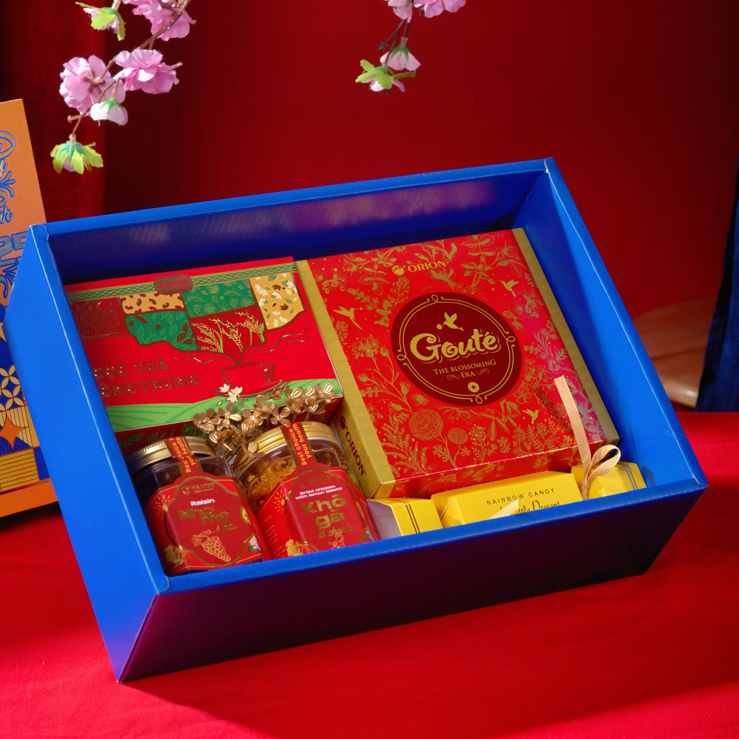 Set quà “Tài Lộc Vạn Xuân” là biểu tượng của hạnh phúc trọn đầy, với sắc đỏ son – vàng kim sang trọng. Bên trong là sự hòa quyện giữa Bánh quy, Ngọc Trà, Khô Gà, Nho Mỹ 3 màu, Kẹo nơ – tượng trưng cho may mắn, sức khỏe và thịnh vượng.