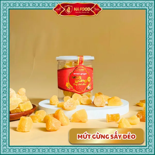 Gừng sấy dẻo Hafood – món ăn truyền thống giữ ấm mùa xuân. Vị cay nhẹ, ngọt thanh, mềm dẻo tự nhiên giúp kích thích vị giác và hỗ trợ tiêu hóa. Là món mứt Tết hiện đại, không phẩm màu, giữ nguyên tinh chất gừng tươi.